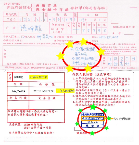郵局無摺存款:請回報「匯款單局號」或在備註欄清楚載明。(詳見下圖範例)